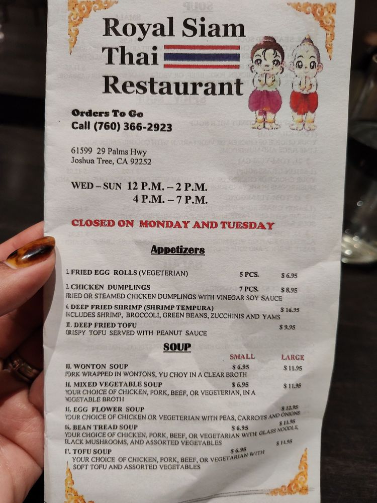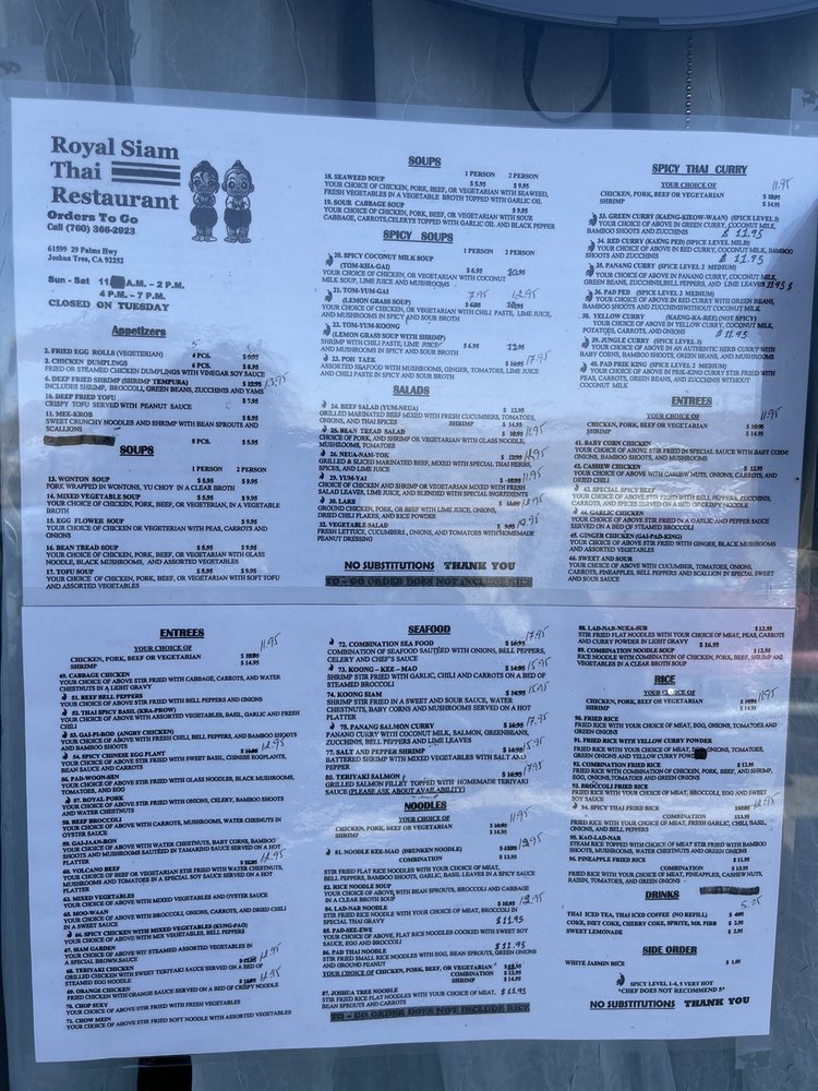 Welcome to Royal Siam Cuisine Thai Restaurant, a delightful destination in Joshua Tree, CA, where the vibrant flavors of Thailand come to life. Specializing in breakfast, brunch, and noodles, this inviting eatery offers a menu designed to cater to various tastes and dietary preferences. With an array of vegetarian and vegan options, everyone can indulge in the authentic tastes of Thai cuisine.